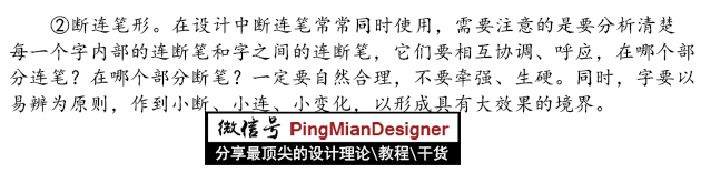 ①重组笔形。对汉字的笔划进行重新修改,在规整、斜度、弧度、空白、切划、分割、粗细、曲直等方面进行变形,使原来的汉字显现特殊而新颖的新字形。需要强调的是,在笔形变化的时候,每字的笔有一定要统一,这样才地产生和谐的美感。